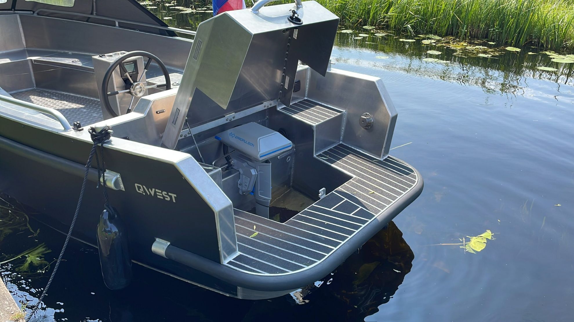 S580 este nava amiral Qwest, un sloop de lux spațios , o ambarcatiune tipic olandeza cu foarte multe optiuni in standard . Este realizata din aluminiu sudat de 4 mm, iar corpul navei a fost dezvoltat special pentru propulsia electrică . Podeaua sudată creează o cutie/perna de aer, lucru ce asigură că barca plutește in orice conditii . Podeaua cu auto-drenaj este prevăzută cu două orificii de scurgere prevazute cu dopuri. Puteți deschide aceste orificii când barca este in staționare pentru a asigura evacuarea automata a apei de ploaie. Sub banchete au fost create 5 spații de depozitare . Barca vine in standard cu consola, timona si cablu de guvernare . Finisajele interioare pot fi personalizate dupa dorinta clientului . Nu ezitati a ne contacta pentru a va consilia in alegerea optiunilor .